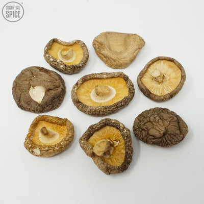 Essential Spice Whole Shiitake Mushrooms are are an edible mushroom that are tan to dark brown in color and can grow up to 4 inches in diameter.